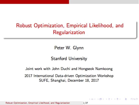 From 19 December 16th to 19th, the 2017 International Data-Driven Optimization Workshop was held at SUFE. The workshop was organized by the SUFE Research Institute for Interdisciplinary Sciences (RIIS), co-organized by FIR Science and Technology Co., Ltd. Chen Xinyuan, Vice President of SUFE, Hu Xiaodong, President of Operations Research Society of China, Dai Yuhong, Director of Operations Research Society of China Mathematical Programming Branch, Ye Yinyu,Professor of Stanford University Department of Management Science and Engineering, Peter Glynn,academician of the US National Academy of Engineering and Li Ziliang, Professor of Stanford University Department of Statistics and other leaders and guests attended the workshop.