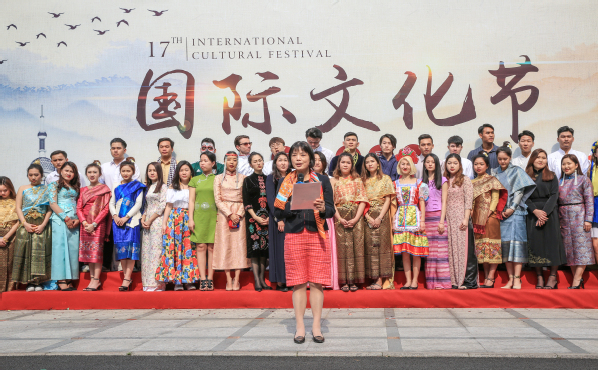 Accompanied by a warm song presented by Huang Ruixin (Laos), international students dressed in their own traditional costumes came to the stage.Vice President Yao Lingzhen addressed and announced the opening of the 17th International Cultural Festival. Chinese and foreign student representatives jointly called for salutes for the International Cultural Festival.