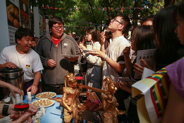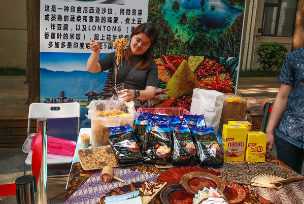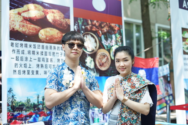 Juwen Granetta (Indonesia) and her friends brought the Indonesian national dish Gado-gado, including crispy vegetables, eggs, chilli sauce, fresh clams, fried tofu and shredded shrimp. She said, “Our booth is packed with Indonesian specialties as well as feature decorations and traditional costumes for everyone to enjoy.