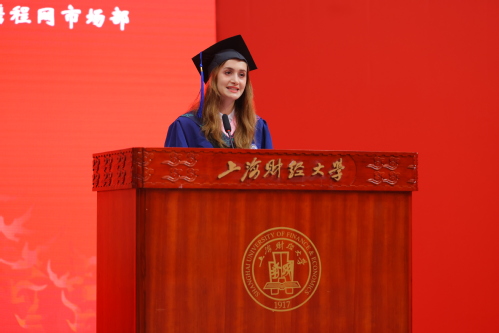 On behalf of the master's degree graduates, Ke Anna, an international student from the School of International Cultural Exchange and College of Business, shared her unforgettable time studying and living in SUFE. Ke Anna, from Georgia, vividly told the story of her relationship with Chinese culture during her study and internship, recalled her original intention of choosing SUFE to learn business majors, talked about her friendship with the teachers and students of SUFE, and shared her valuable experience of participating in traditional cultural activities and serving as the host of the International Cultural Festival. In the future, she will continue to carry the imprint of Sufers, harbor the love for traditional Chinese culture, and use what she has learned in SUFE to tell Chinese stories and build bridges between Chinese and foreign cultures.