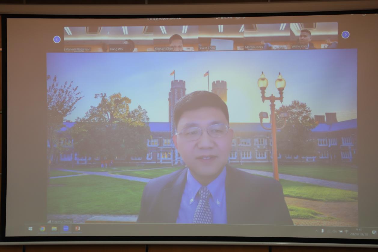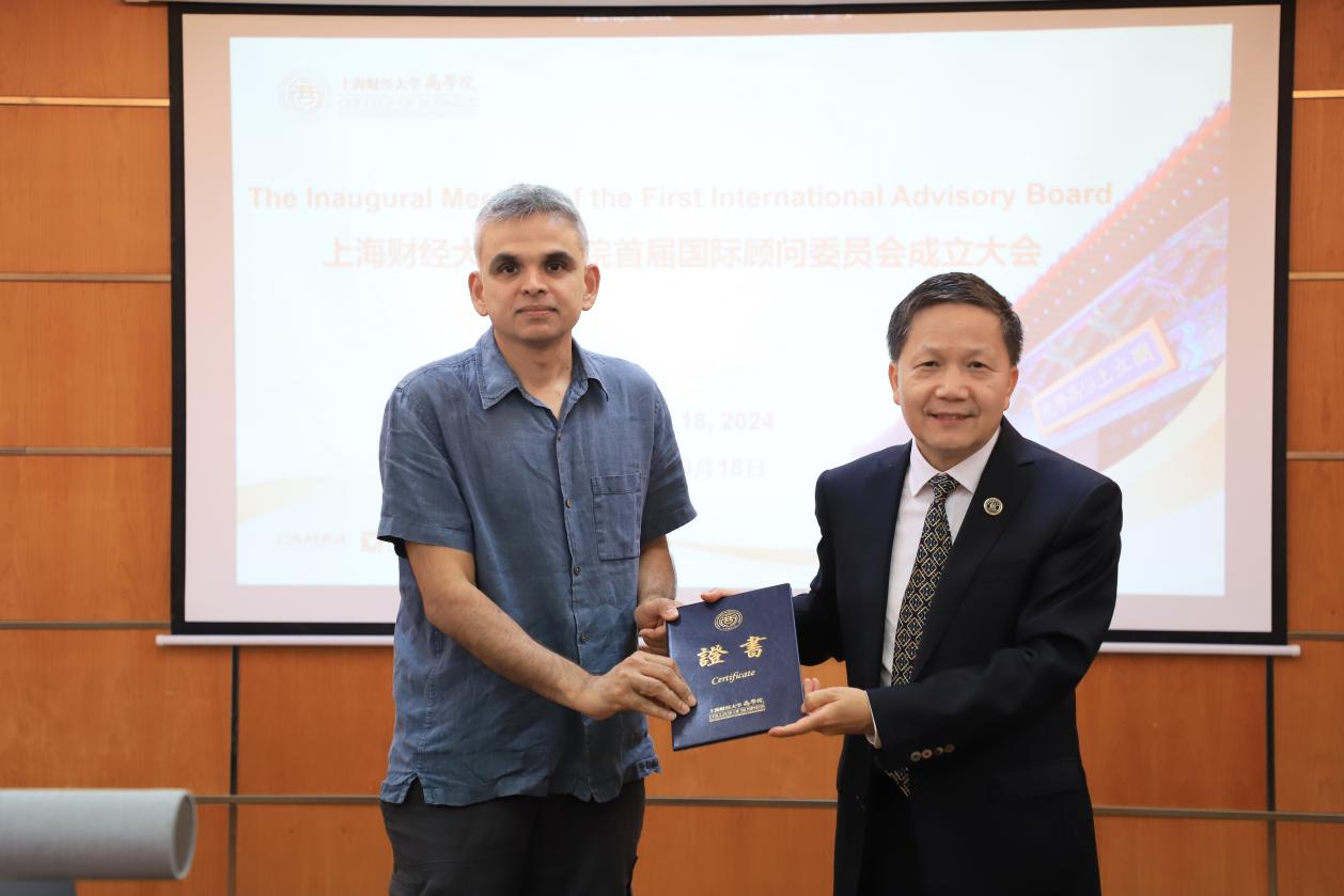 Following the welcome addresses, the certificate presentation ceremony for the International Advisory Board took place. Prof. Zhang Fuqiang from Washington University in St. Louis was appointed as the Chair of the board. He briefly introduced the outstanding backgrounds of the board members. Sun Qi announced the appointments of the inaugural board members, who come from renowned educational institutions such as Harvard Business School, MIT, University of Melbourne, University of British Columbia's Sauder School of Business, and Vrije University Amsterdam, and so on. Finally, Chen Xinyuan presented certificates to the on-site board members Yuxin Chen, Martyn Jones, Cornelis Gerrit Koedijk, and Mahesh Nagarajan.