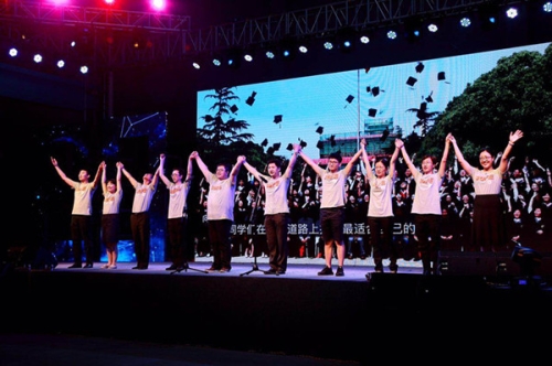 On the evening of June 20th, the SUFE Graduation Gala titled Years Passing by as Song was held at the Badminton Stadium. SUFE leaders Fan Liming, Liu Yongzhang, Liu Lanjuan, Fang Hua, Jiang Chuanhai, Yao Lingzhen, and Zhu Mingxiong, along with a other school leaders and teacher representatives and more than one thousand graduates wearing a light-colored graduation shirts gathered together to recall the years that they spent in SUFE.