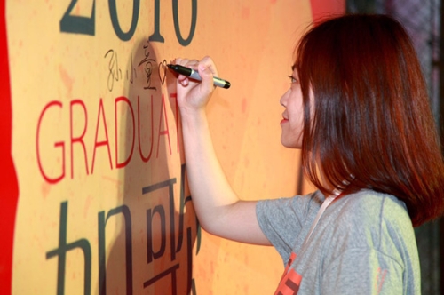 First graduates entered the Badmintion Stadium and took pictures in front of the huge graduation poster at the door, taking what perhaps would be the last photo of their four year journey. Then some bought graduation souvenirs at the Tongyuan Bazzar, while others happily looked for themselves on the smiley face wall.