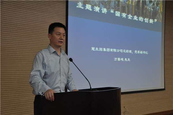 Wan Lijun, General Manager of Guan Shengyuan delivered a speech concerned with “the Innovation and Reform of State-owned Enterprise”. He states that the traditional industries need to be transformed as the internet and economy develop. The State-owned Enterprises should search for innovative talents to attract and unite them to help to transform the state-owned capital into vigorous social innovative resources. He also encouraged the students to not be limited by what had been done and to “regard sickness as a mentor and difficulty as a friend”.
